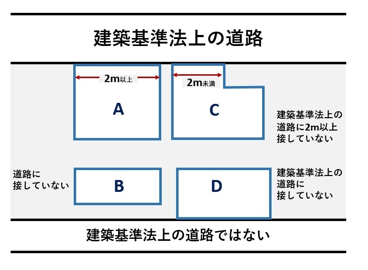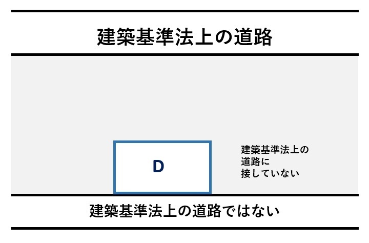 右記『D』は接道しているが、接道している道路が建築基準法上の道路ではない為、再建築不可になります。解決するには上記特徴2とほぼ同じになりますが、建築基準法上の道路まで接道させるか、43条但し書き許可等を取得する必要があります。
